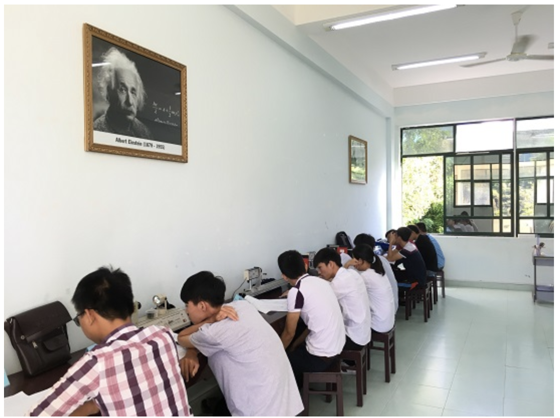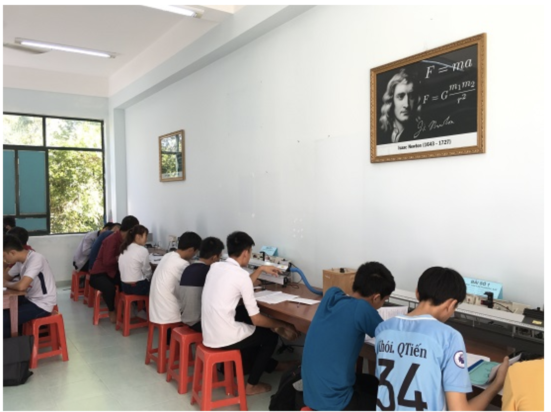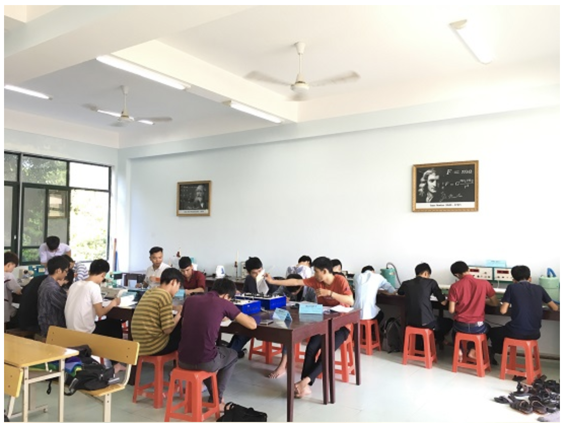 - Thiết bị thí nghiệm: Đã trang bị trên 30 bộ thí nghiệm từ hãng sản xuất thí nghiệm nổi tiếng Leybold (Cộng hòa liên bang Đức) và Viện Vật lý Kỹ thuật, trường ĐH Bách Khoa Hà Nội. Các bộ thí nghiệm hiện đại, có độ chính xác cao như: Khảo sát chuyển động của vật trên đệm không khí, Hiện tượng giao thoa với tia Laser, Hiện tượng quang điện và xác định hằng số Planck, Hiện tượng nhiệt điện, Máy đếm phóng xạ Geyger-Muller, Đi-ốt và Transitor bán dẫn, v.v…